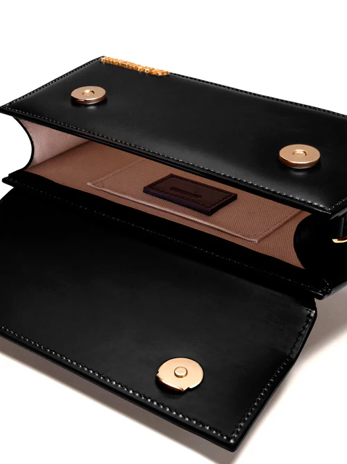 This elongated take on the brand’s signature silhouette is crafted from smooth leather with a structured finish. It features a fold-over flap secured by a magnetic closure, a small sculptural top handle, and a detachable, adjustable strap for versatile styling. Gold-tone logo lettering accents the front, while a lined interior with a slip pocket keeps essentials neatly in place.