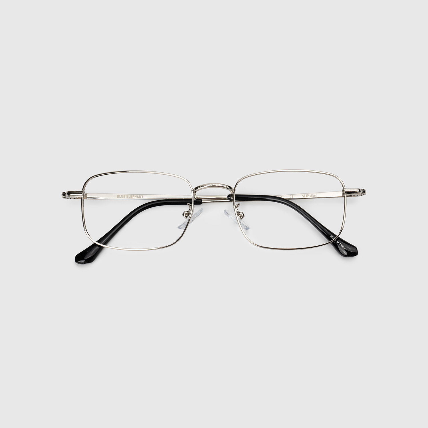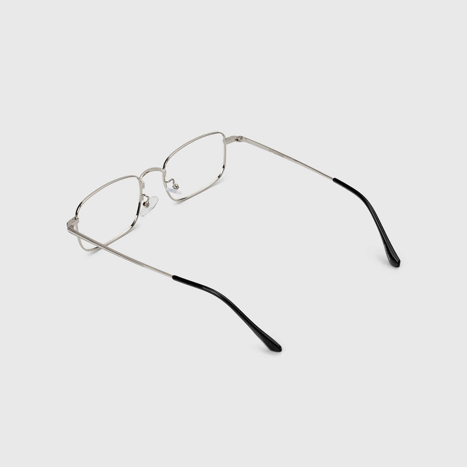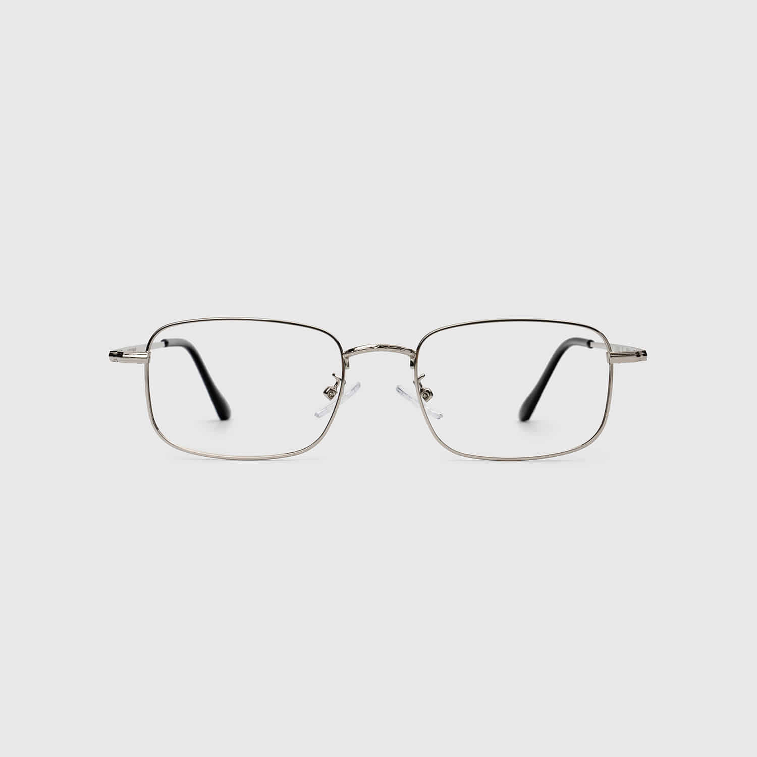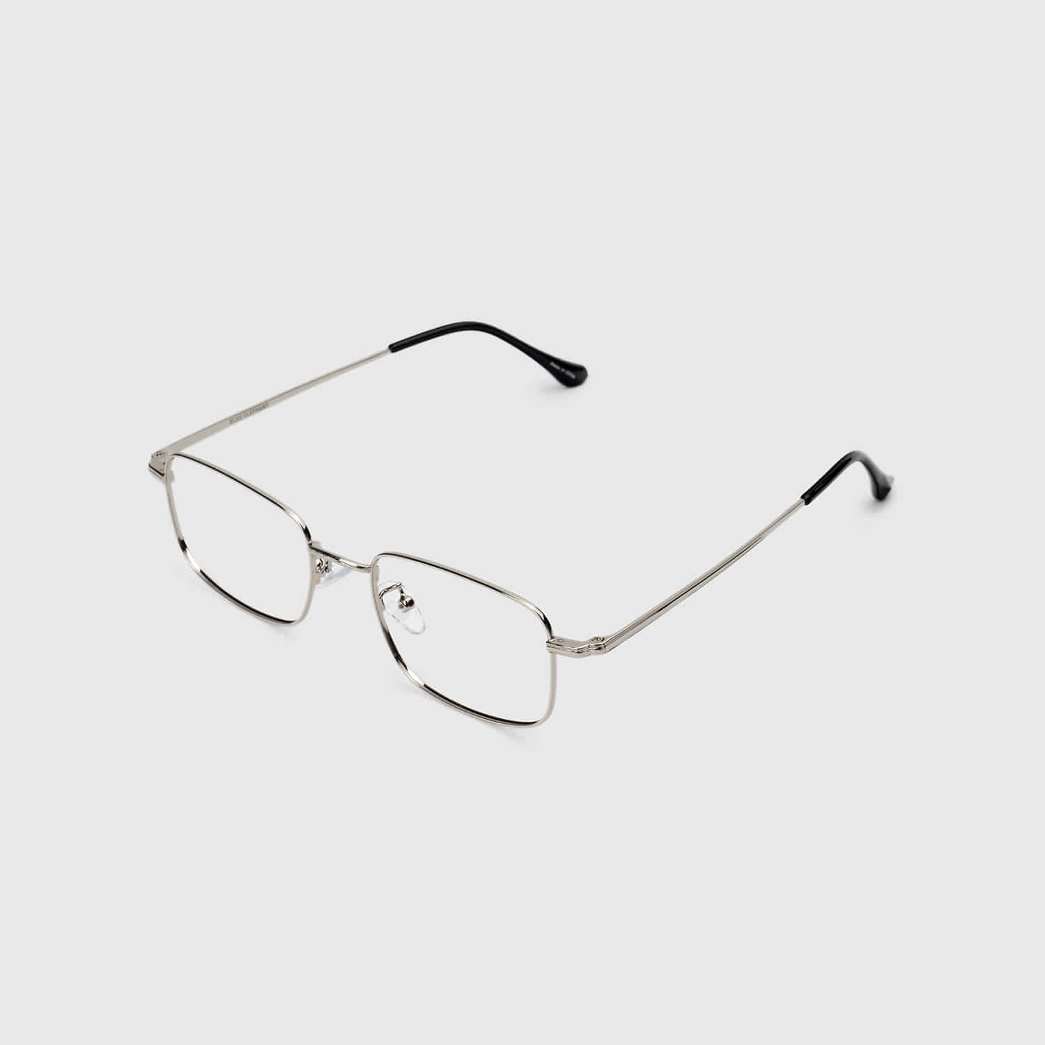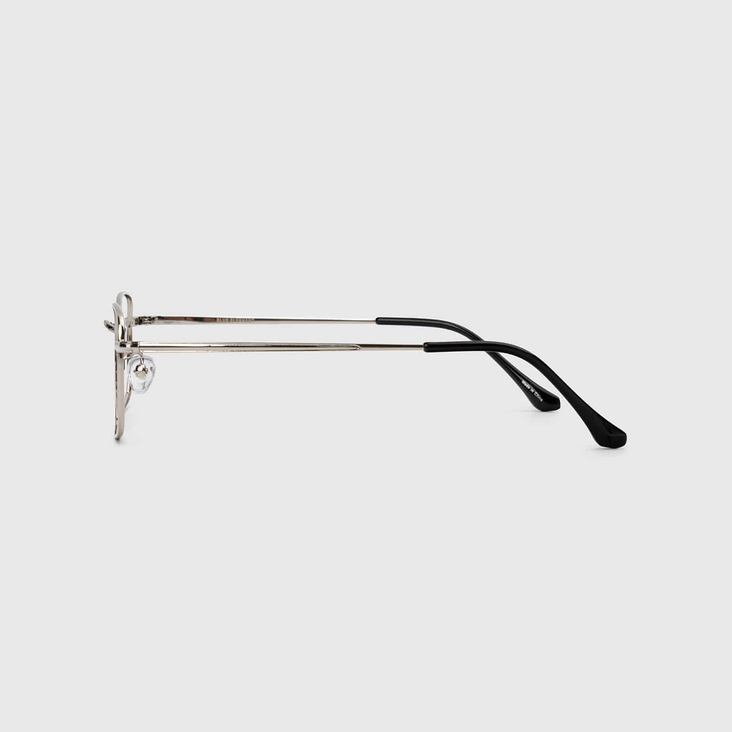 Eyeglasses with a metallic silver-toned finish, offering a modern industrial edge. Lightweight and refined for all-day wear.